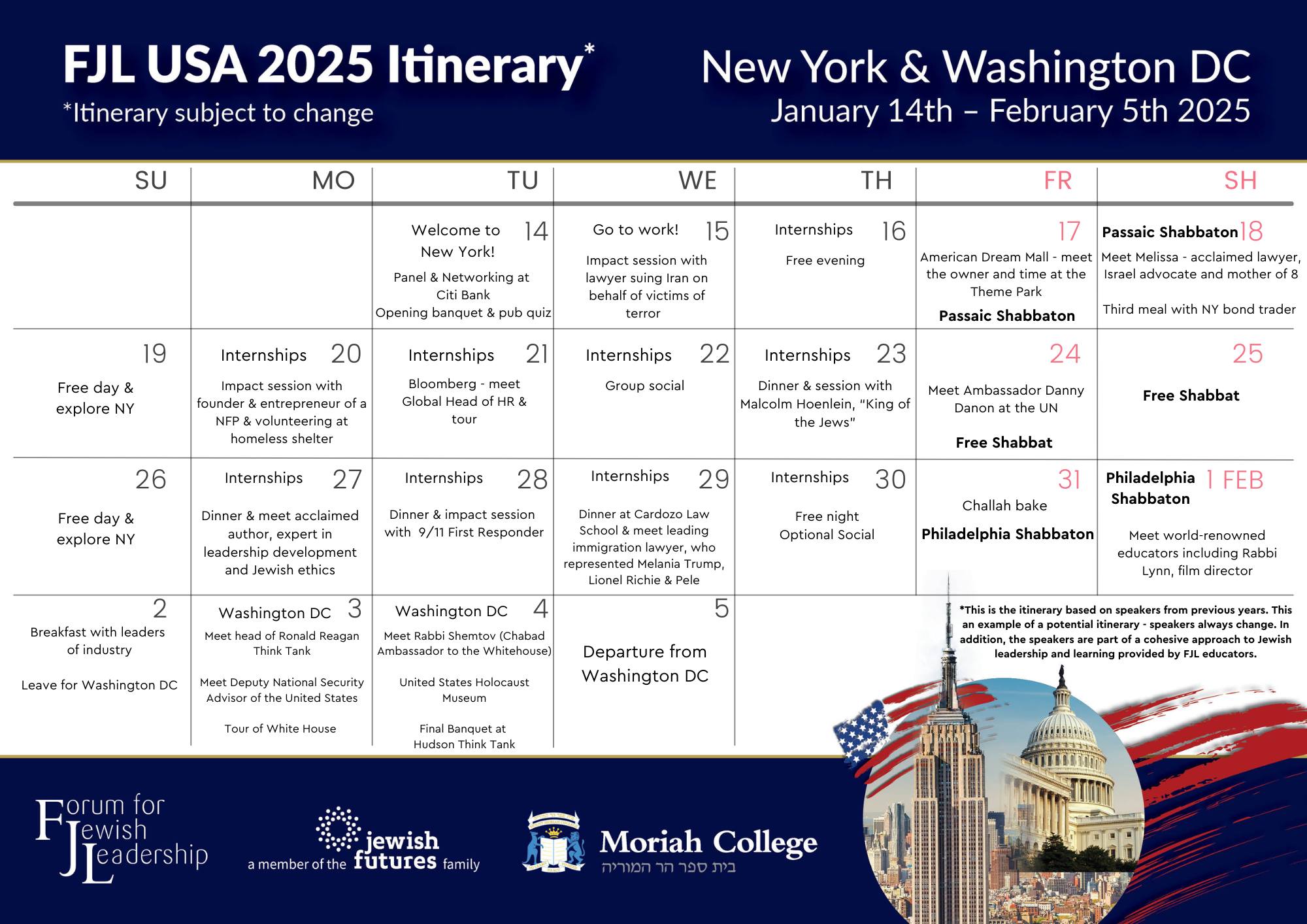 The cost of the New York/DC programmes includes accommodation for the entire duration, all trips, events, and group transportation (with the exception of occasional train travel), as well as Shabbatons and various social events. Light breakfast snacks are provided daily, along with lunch on working days, and dinner on evenings when there is programming and all meals are included during Shabbatons. The programme also covers speakers, unique experiences, activities, as well as all programme materials. Staff support is provided throughout, including coordination of the internship process, guidance and mentoring before and during the programme.